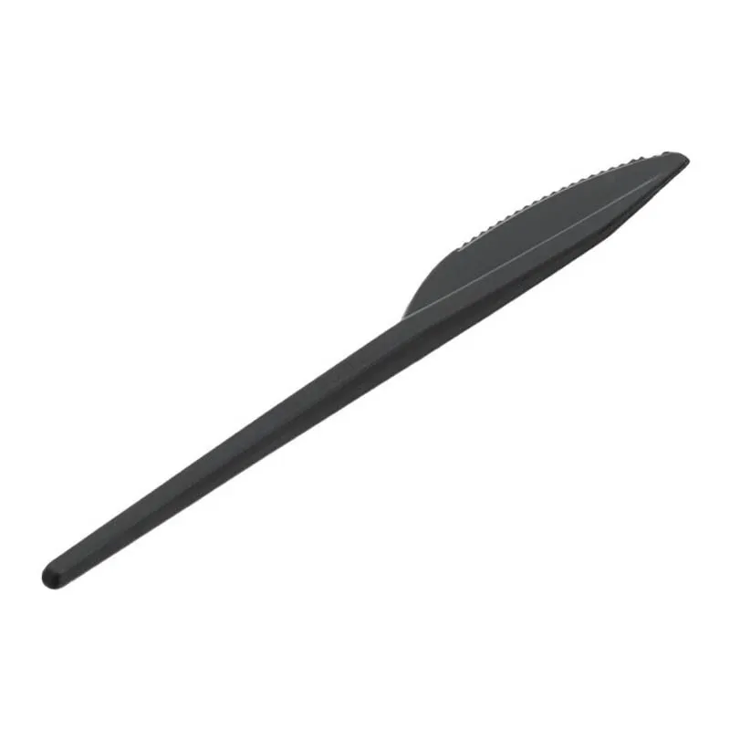 Cuchillos Biodegradables y Compostables de CPLA (almidón de maíz) Negros de 18cm. También llamados Cuchillos Ecológicos Desechables al ser 100% Compostables. Son perfectos para celebraciones, hostelería, catering y aptos para comida caliente y fría. Al tratarse de cuchillos compostables, una vez que disfrutemos de ellos los podemos depositar en el cubo marrón orgánico y estaremos contribuyendo a cuidar el medio ambiente. Unidad de venta en paquetes de 50 unidades o cajas de 500 Uds.