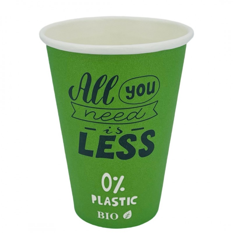 El diseño representa un árbol sobre fondo blanco con una inscripción en verde que destaca su carácter biodegradable, reforzando así su imagen ecológica. Estos vasos de cartón de 200 ml son una opción ideal para establecimientos que ofrecen bebidas para llevar, gracias a su resistencia y compromiso sostenible.